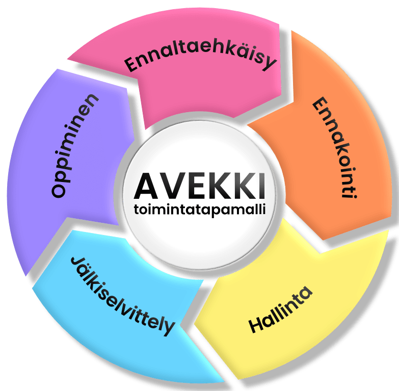 AVEKKI-toimintatapamalli on prosessi, ammatillisten toimintojen sarja, alkaen ennaltaehkäisystä ja ennakoinnista edeten hallinnan kautta jälkiselvittelyyn ja tilanteesta oppimiseen.